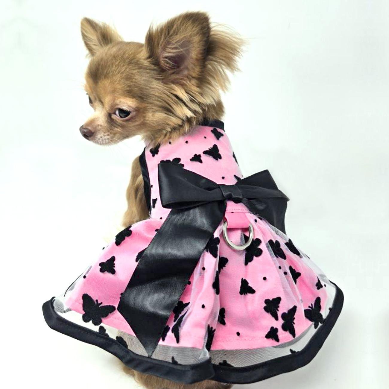 You'll be all aflutter with this classically elegant harness dress comes in pink with black trim, black bow, and a sweet butterfly overlay.  Comes with a solid color satin leash and D-ring (size XL does not have D-ring or leash hole).